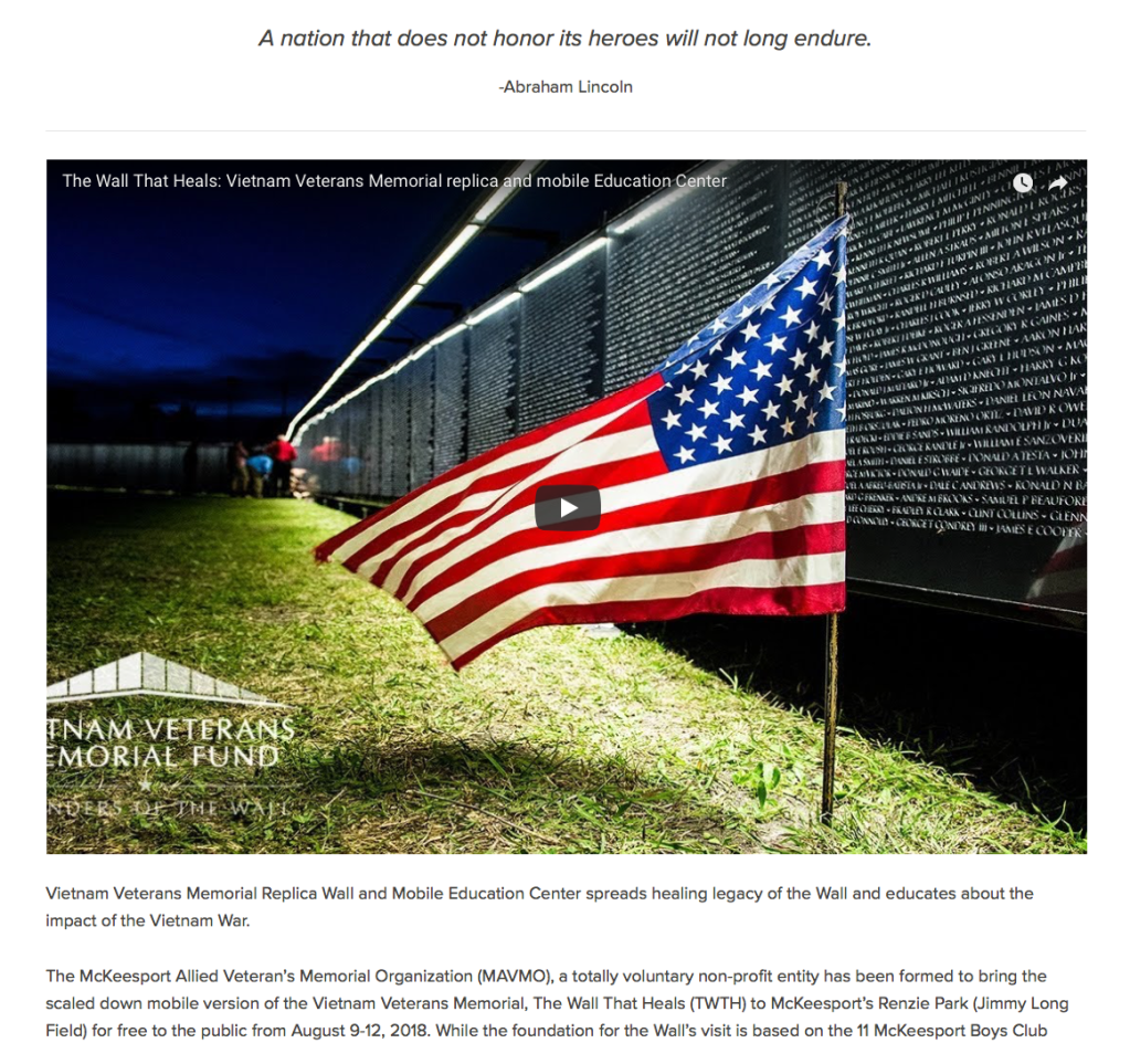 This website was designed for a local initiative to bring “The Wall That Heals” to The Mon Valley/McKeesport, PA. The site has attracted thousands of visitors and views since its launch and has helped promote the event while also being a hub for volunteers, veterans, and local history buffs.